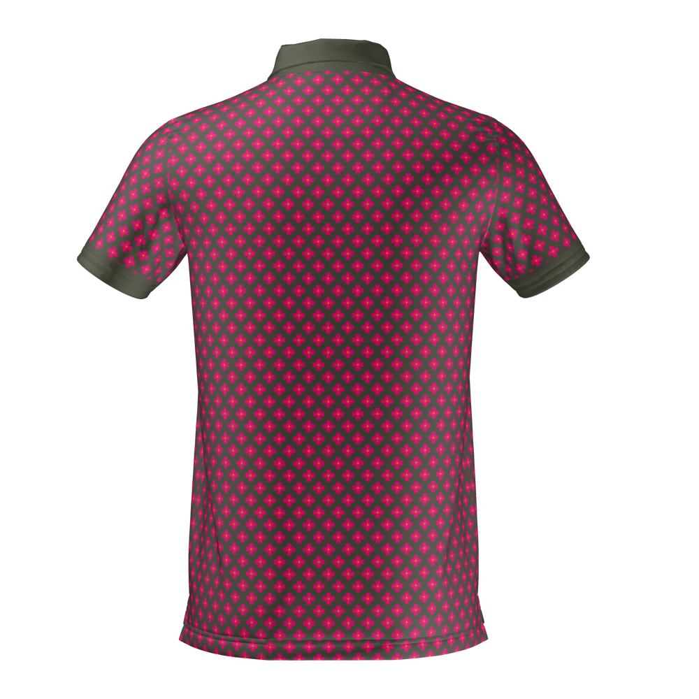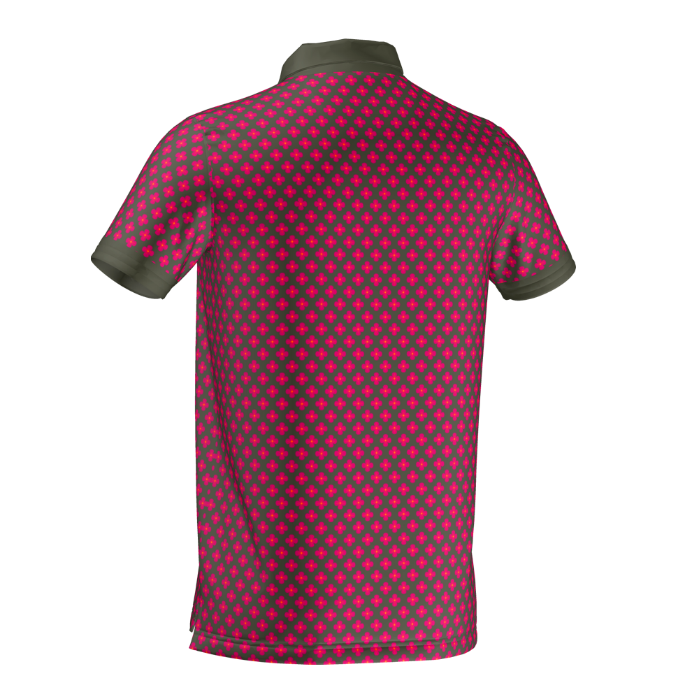Custom Fit. Khaki polo with pink floral all-over design and tonal collar. Made to order, shipped in 10 days.