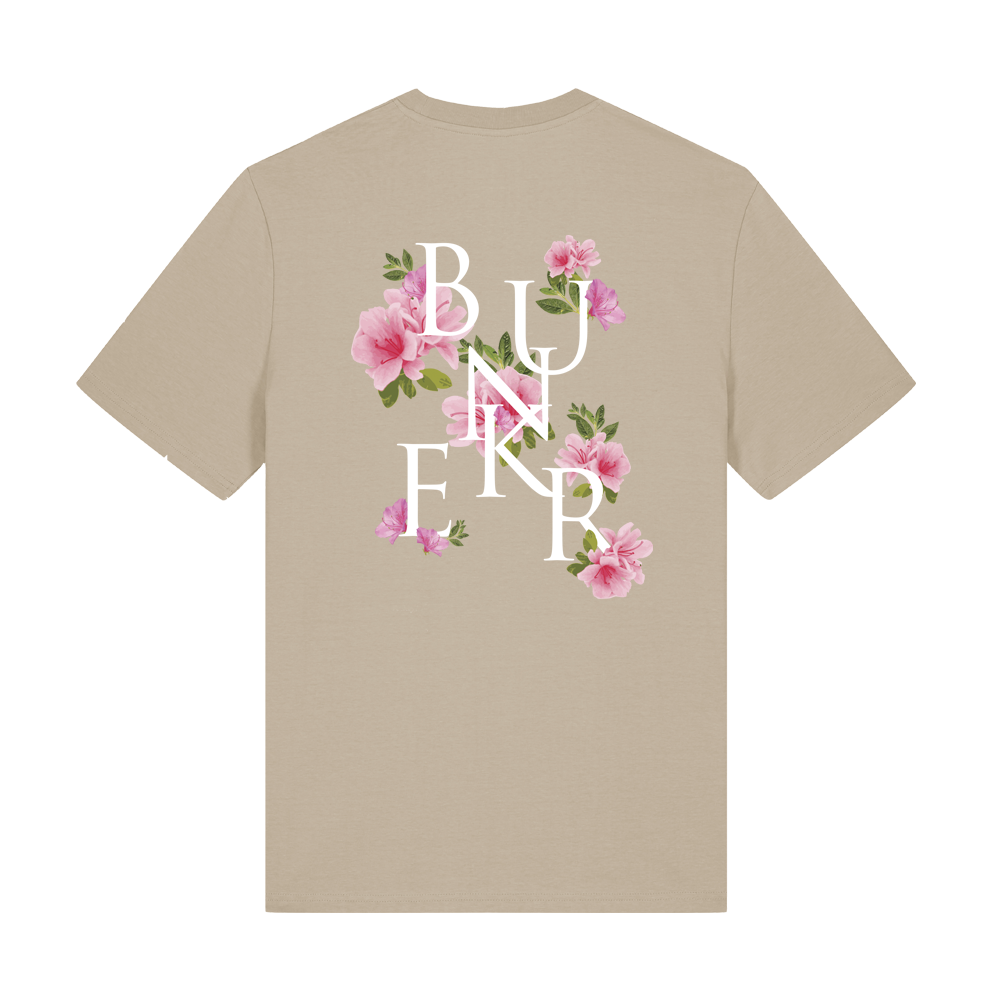 Finished with a clean Bunker logo on the chest and a large Azalea graphic across the back, creating a balanced contrast between subtle front detail and a more expressive rear design.