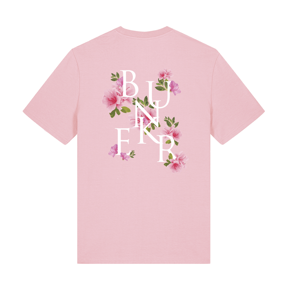 Finished with a clean Bunker logo on the chest and a large Azalea graphic across the back, creating a balanced contrast between subtle front detail and a more expressive rear design.