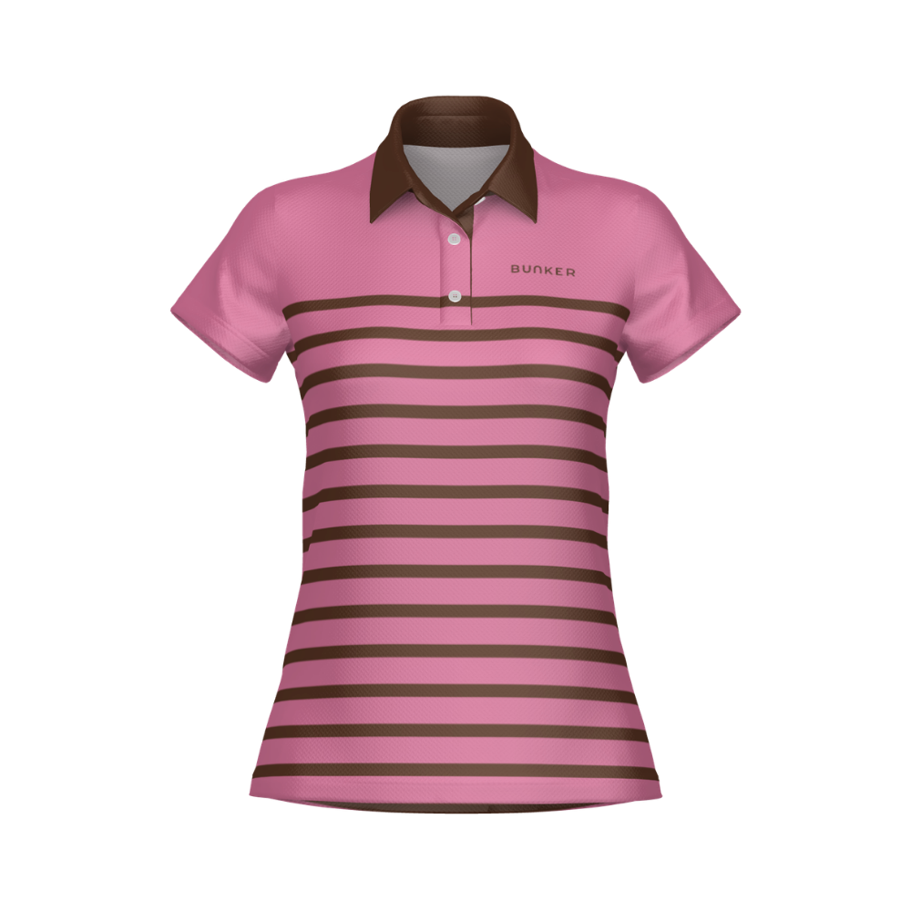 Combining this seasons fashion colours, a simple clean stripe with block off rose pink base colour with contrast stripes and collar. Deigned to feel confident on the course and easy to pair with both classic and contemporary golf looks.