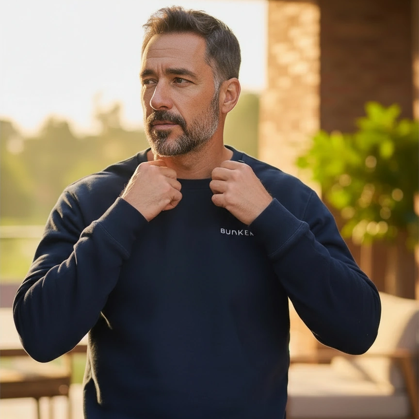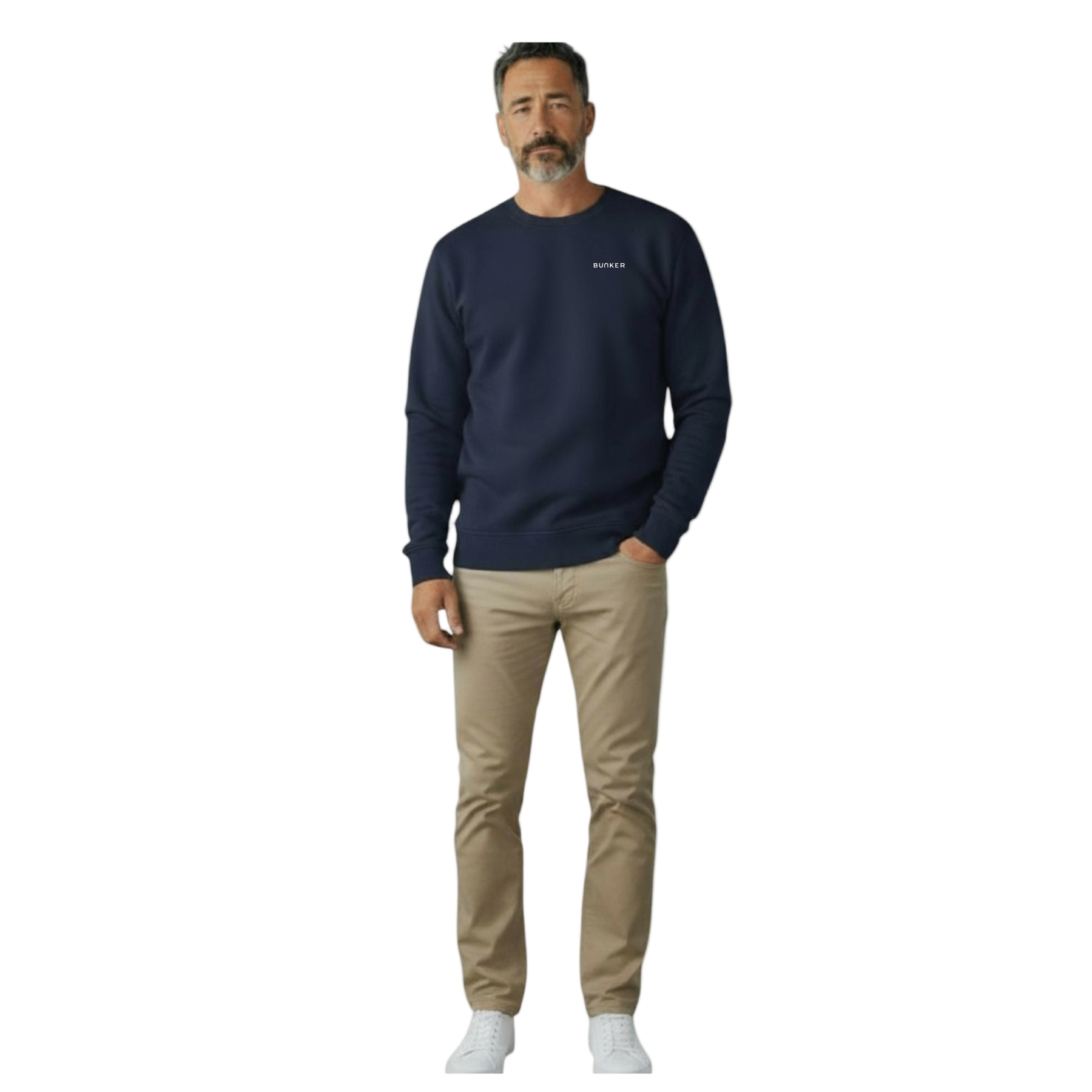 This Navy Sweater brings a new level of premium to your wardrobe. Features the reframed Bunker Logo in a high-quality white elevated silicone motif, a timeless addition to your collection.